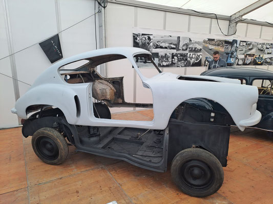 rote Zielscheibe in der Mitte des Rades, ein weiteres Automobilsymbol, steht für die Herausforderungen, denen sich die Marke in den nächsten 70 Jahren stellen wird.